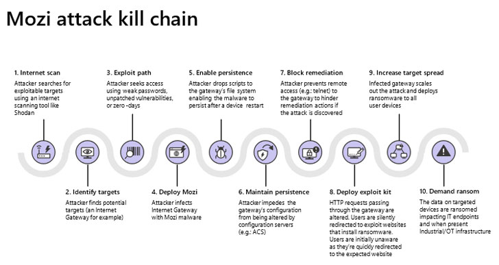 "Network gateways are a particularly juicy target for adversaries because they are ideal as initial access points to corporate networks," researchers at Microsoft Security Threat Intelligence Center and Section 52 at Azure Defender for IoT said in a technical write-up. "By infecting routers, they can perform man-in-the-middle (MITM) attacks—via HTTP hijacking and DNS spoofing—to compromise endpoints and deploy ransomware or cause safety incidents in OT facilities."